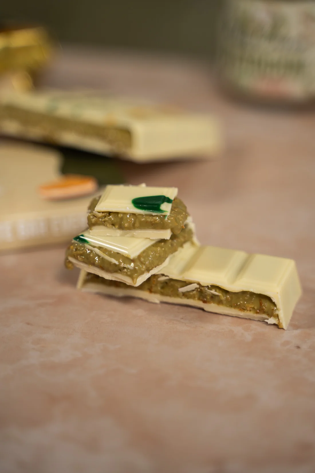 Ein echtes Highlight: Wei?schokolade aus Dubai, die durch frische Pistazien bereichert wird.
